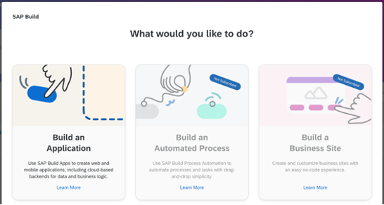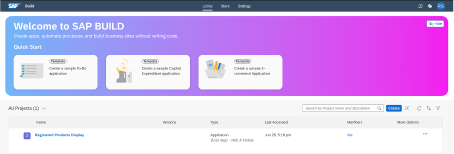 Vom SAP BTP Cockpit aus greifen wir zum Einstieg auf die SAP Build Lobby zugreifen, in der Projekte erstellt werden. Hierüber können neue Anwendungen unterschiedlichen Typs erstellt werden