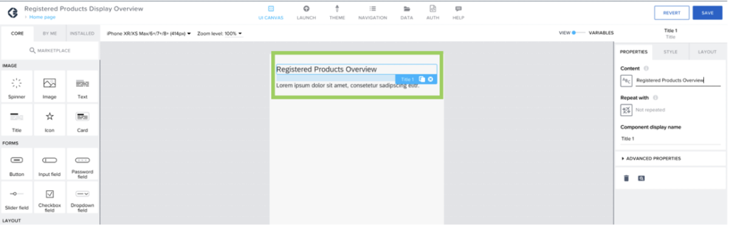 Passen wir nun das Bildschirmlayout an. Dazu wählen wir die Komponente „Header“ und den Titel auf dem UI-Canvas aus.