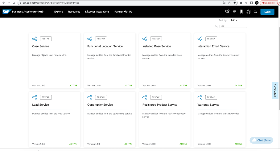 Bevor wir allerdings mit der Datenbindung fortfahren können, werfen wir einen Blick auf die erwähnten Service Cloud V2 APIs, die im Business Accelerator Hub unter der folgenden URL bereitgestellt werden: