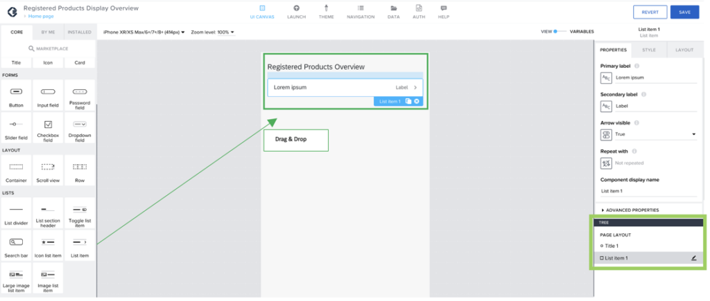 Navigieren wir nun zur Komponentenbibliothek und suchen die Komponente List Item. Per Drag and Drop kann diese auf dem View Canvas unterhalb des Titels platziert werden.