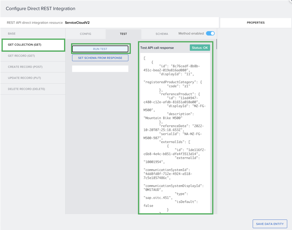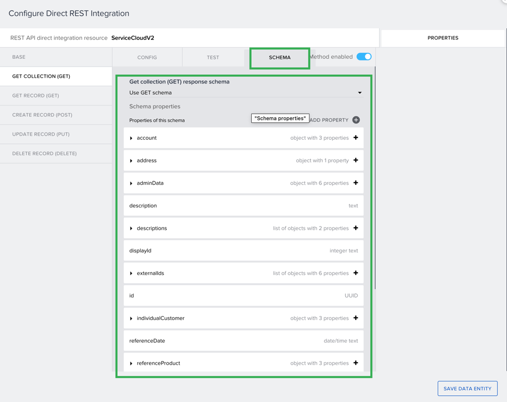 Die Funktion “Get Collection” ermöglicht das Abrufen aller Datensätze aus der Remote-Entität. Um dies zu konfigurieren, müssen wir zunächst unser Schema definieren. Wir rufen dazu die Registerkarte “Schema” auf und fügen Sie Eigenschaften ein, die auf den Attributen der Entität basieren. Wir müssen sicherstellen, dass diese Eigenschaften genau den Namenskonventionen entsprechen, die in unserer Entität verwendet werden.