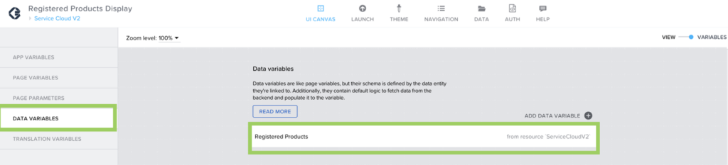Der erste Schritt ist das Hinzufügen (+ Symbol) einer Datenvariablen. Wie die Beschreibung sagt, wird das Schema der Datenvariablen durch die Entität definiert, die in unserem Szenario dem der Registrierte Produkte entspricht, mit der sie verknüpft sind. Darüber hinaus enthalten sie eine Standardlogik, um Daten aus dem Backend zu holen und in die Variable einzufügen.