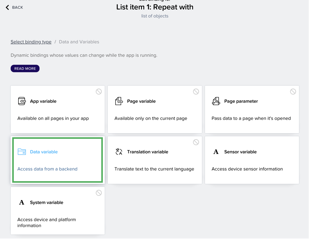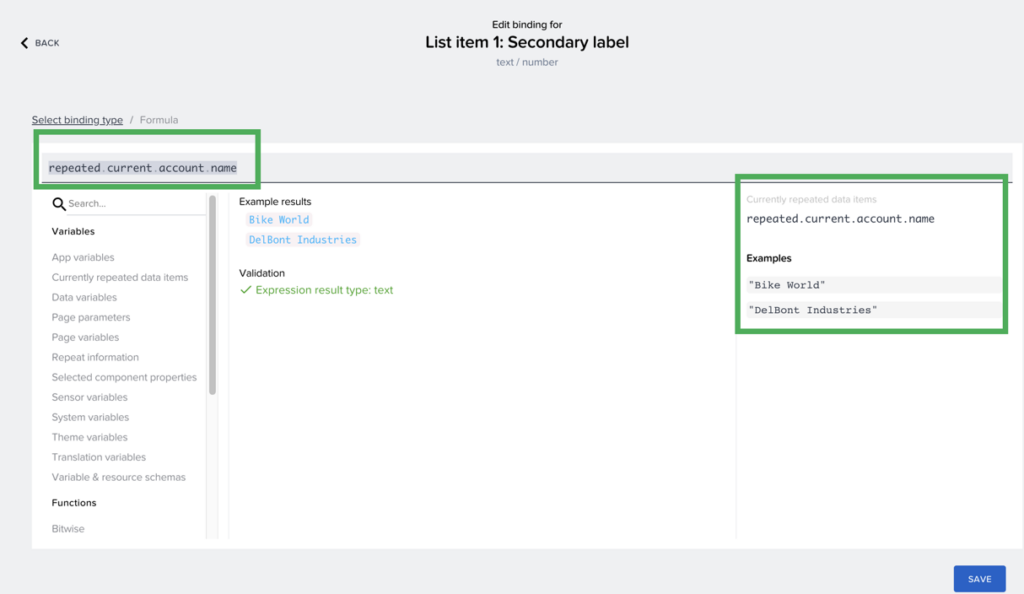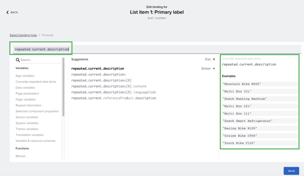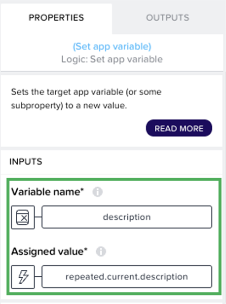 Für die bereits definierte App-Variable setzen wir den Namen auf “description” und weisen den Wert “repeated.current.description” aus der Datenquelle zu.