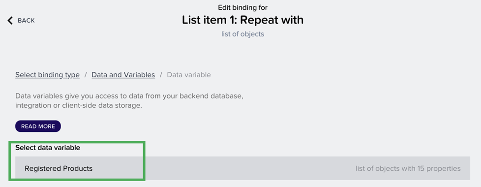 Wir wählen die Datenvariable “Registrierte Produkte” aus, die uns den Zugriff auf die Backend-Datenbank der Service Cloud V2 ermöglicht.