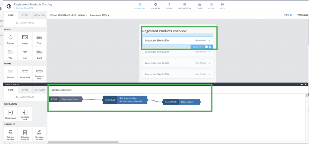 Jetzt navigieren wir zurück zum UI CANVAS und fügen unserem Listenelement im unteren Bereich Logik hinzu, indem wir auf das Pfeilsymbol (“Add logic to LIST ITEM 1“) klicken.
