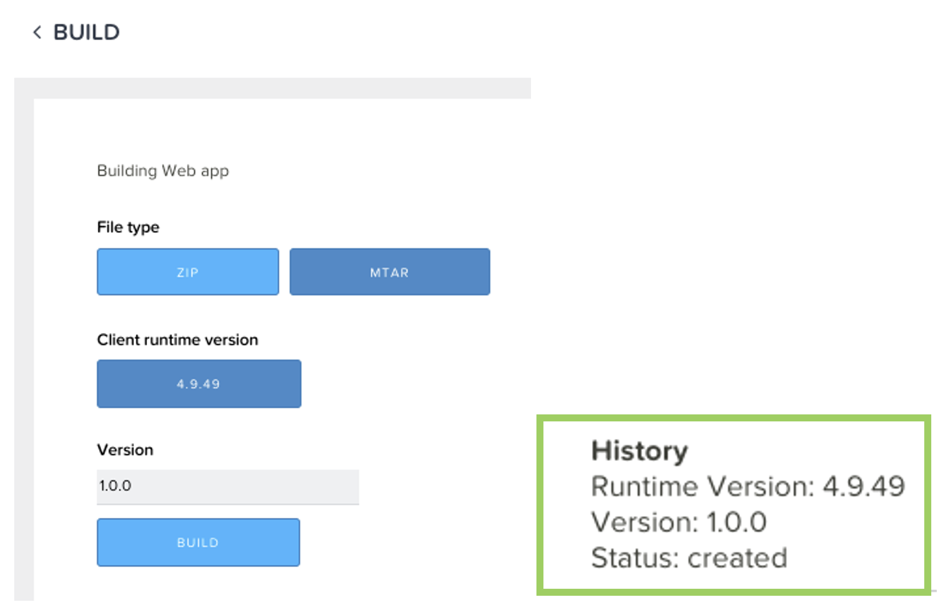 Vor dem Erstellen können wir das Dateiformat des Builds konfigurieren. Für die BTP Cloud Foundry-Laufzeit wird das Dateiformat „.mtar“ (Multi-Target-Anwendung) empfohlen. Wir geben eine Version an und wählen die vorgeschlagene Client-Laufzeitversion aus und klicken schließlich auf “Build“. Anschließend werden der Verlauf und der Status angezeigt und wir können die Lösung direkt auf BTP bereitstellen oder als Mashup in Service Cloud V2 einbinden.