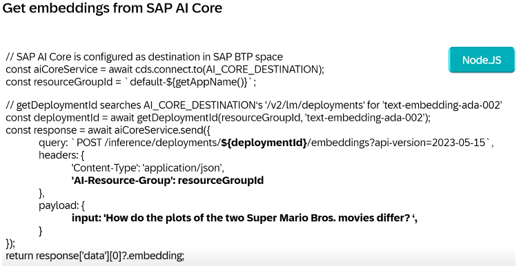 Die CDS-Entität Movies beinhaltet also einen Vektor Datentyp und einen darauf basierenden Service. Die Embeddings werden über die SAP AI Core innerhalb der NodeJS-Applikation abgefragt: