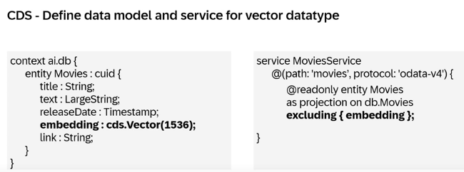 Entwickler können also mit Hilfe der CAP-Dokumentation und GPT-4 ein Beispiel für eine Filmdatenbank erstellen, die die SAP HANA Vector Engine für die effiziente Speicherung und Abfrage von Vektoreinbettungen nutzt. Das zu Grunde liegende CAP-Datenmodell sieht in Teilen wie folgt aus:
