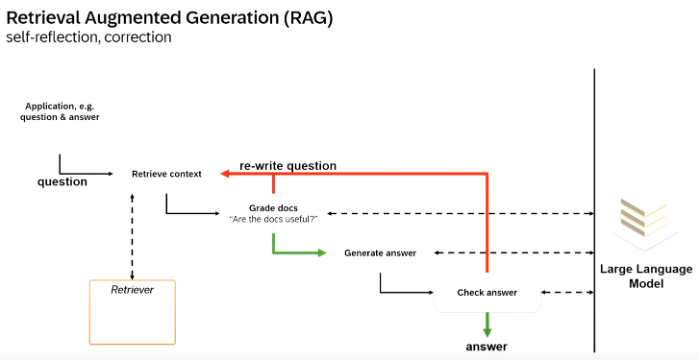 🤖Agentenbasiertes Retrieval nutzt LLMs zur intelligenten Auswahl geeigneter Datenquellen, während LLMs durch Selbstreflexion die Kontextrelevanz bewerten und verfeinern können (=>‚self-reflection, correction‘):