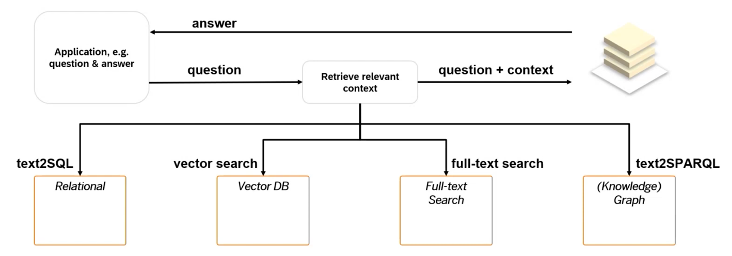 Das Problem ist, dass vortrainierte Basismodelle unzureichend oder unvollständig sein können, was zu unzureichenden oder falschen Ergebnissen führen kann. Daher kommt RAG (= Retrieval Augmented Generation) zum Einsatz. RAG verbessert LLM-Antworten durch die Bereitstellung von relevantem Kontext und die Kombination von Abfrage und Generierung, um genauere und fundiertere Antworten zu erhalten – siehe Schaubild: